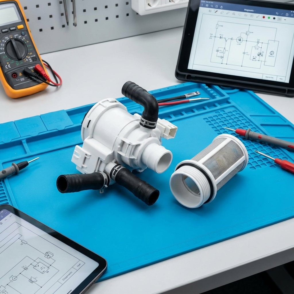 Q: How do I know if my washing machine drain pump is broken? A: A failed drain pump shows several symptoms: complete silence when the drain cycle activates (pump motor not running), a loud grinding or rattling noise from the pump area indicating mechanical failure, a humming sound without water movement suggesting a stuck impeller, error codes specifically related to drainage (varies by brand), or water draining extremely slowly over 15-20 minutes. To test, manually spin the pump impeller (access through pump filter opening)—it should rotate freely. If stuck, broken, or loose, the pump needs replacement.